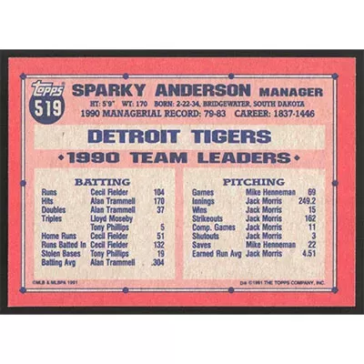 This is a 1991 Topps Sparky Anderson baseball card. The card is #519 and pictures show condition.