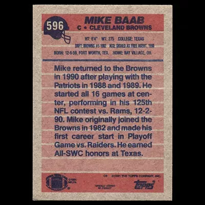This is a 1991 Topps Mike Baab football card. The card is #596 and is in NM-MT condition.