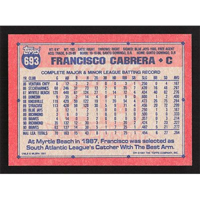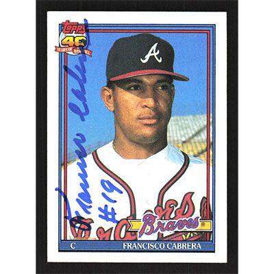 This is a 1991 Topps Francisco Cabrera autographed baseball card. This card has been signed, in blue, by Francisco Cabrera, and is guaranteed authentic by Ballcardz.com. The card is #693 and pictures show condition.