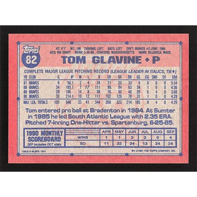 This is a 1991 Topps Tom Glavine baseball card. The card is #82 and pictures show condition.