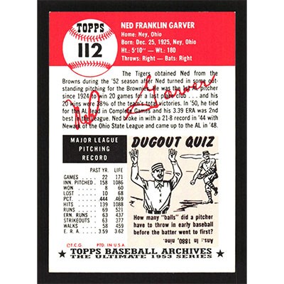 This is a 1991 Topps Archives 1953 Ned Garver baseball card. The card is #112 and pictures show condition.