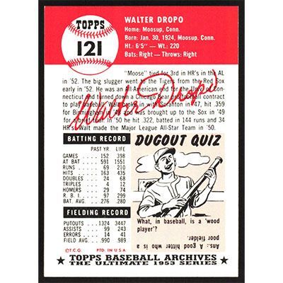 This is a 1991 Topps Archives 1953 Walt Dropo baseball card. The card is #121 and pictures show condition.
