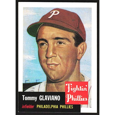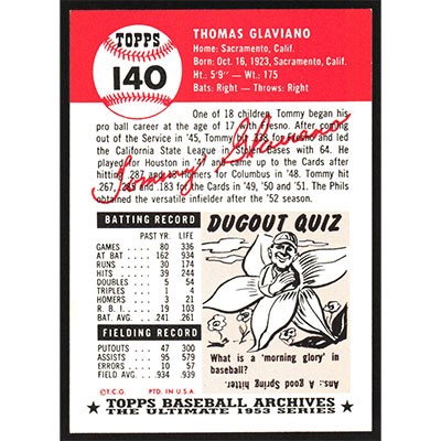 This is a 1991 Topps Archives 1953 Tommy Glaviano baseball card. The card is #140 and pictures show condition.