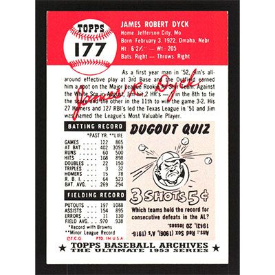 This is a 1991 Topps Archives 1953 Jim Dyck baseball card. The card is #177 and pictures show condition.