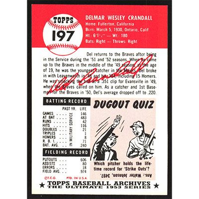 This is a 1991 Topps Archives 1953 Del Crandall baseball card. The card is #197 and pictures show condition.