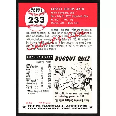 This is a 1991 Topps Archives 1953 Al Aber baseball card. The card is #233 and pictures show condition.