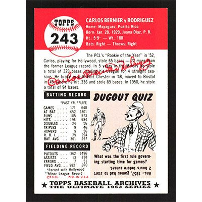 This is a 1991 Topps Archives 1953 Carlos Bernier baseball card. The card is #243 and pictures show condition.