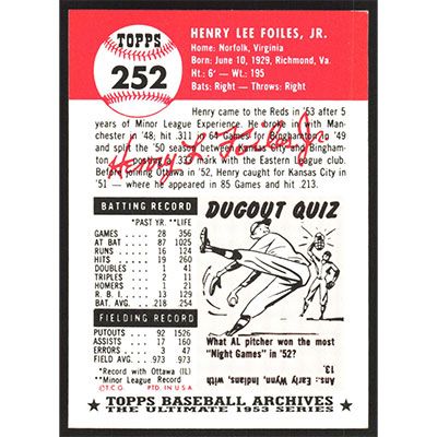 This is a 1991 Topps Archives 1953 Henry Foiles baseball card. The card is #252 and pictures show condition.