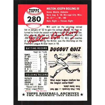 This is a 1991 Topps Archives 1953 Milt Bolling baseball card. The card is #280 and pictures show condition.