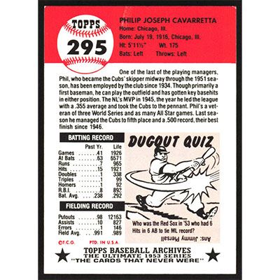 This is a 1991 Topps Archives 1953 Phil Cavarretta baseball card. The card is #295 and pictures show condition.