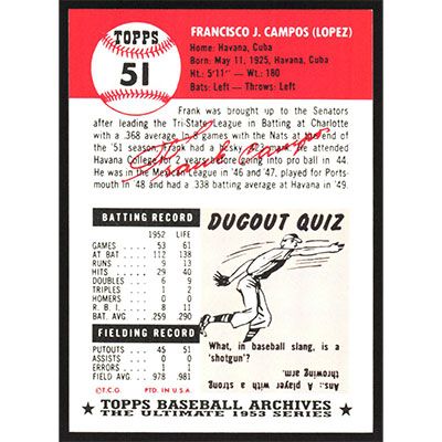 This is a 1991 Topps Archives 1953 Frank Campos baseball card. The card is #51 and pictures show condition.