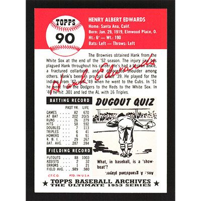This is a 1991 Topps Archives 1953 Hank Edwards baseball card. The card is #90 and pictures show condition.