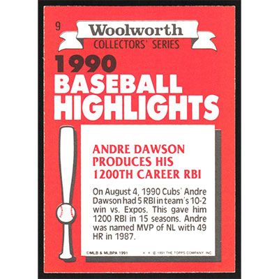 This is a 1991 Topps Woolworth's Andre Dawson baseball card. The card is #9 and pictures show condition.