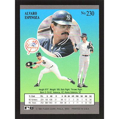 This is a 1991 Ultra Alvaro Espinoza baseball card. The card is #230 and pictures show condition.