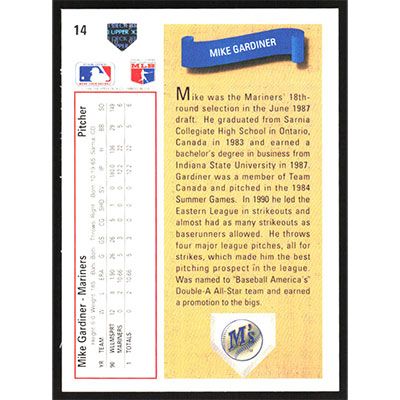 This is a 1991 Upper Deck Mike Gardiner Star Rookie baseball card. The card is #14 and pictures show condition. Team(s): Seattle Mariners Rookie Card (RC)
