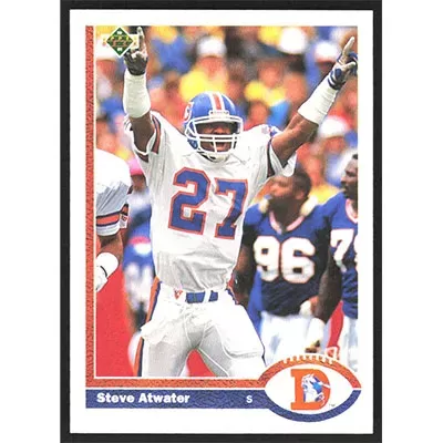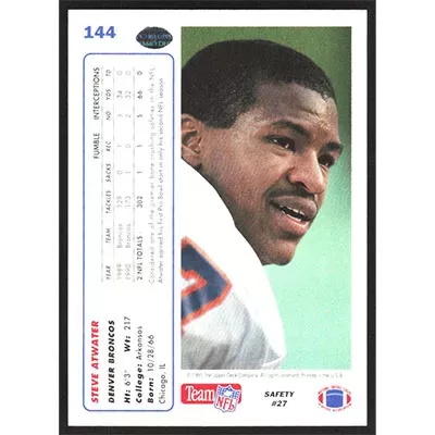 This is a 1991 Upper Deck Steve Atwater football card. The card is #144 and pictures show condition.