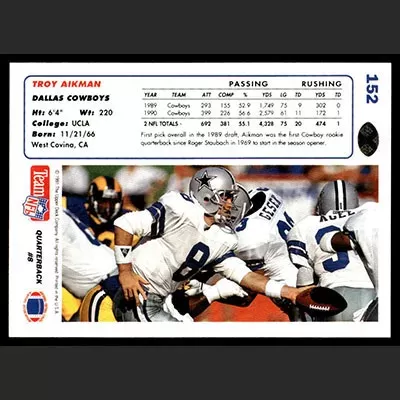 This is a 1991 Upper Deck Troy Aikman football card. The card is #152 and is in NM-MT condition.