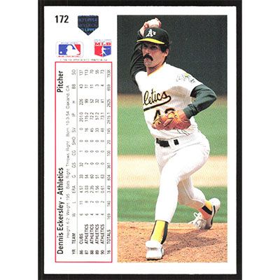 This is a 1991 Upper Deck Dennis Eckersley baseball card. The card is #172 and pictures show condition.