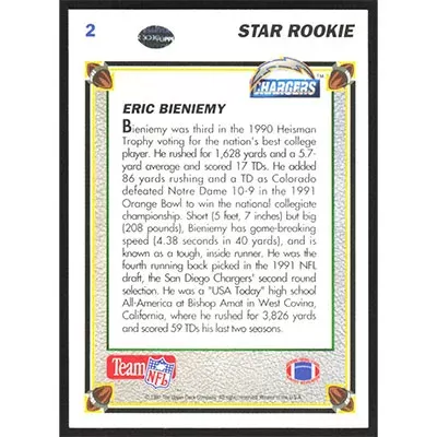 This is a 1991 Upper Deck Eric Bieniemy Star Rookie football card. The card is #2 and pictures show condition.