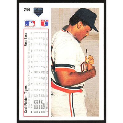 This is a 1991 Upper Deck Cecil Fielder baseball card. The card is #244 and pictures show condition.