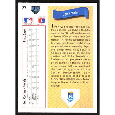 This is a 1991 Upper Deck Jeff Conine Star Rookie baseball card. The card is #27 and pictures show condition. Team(s): Kansas City Royals Rookie Card (RC)