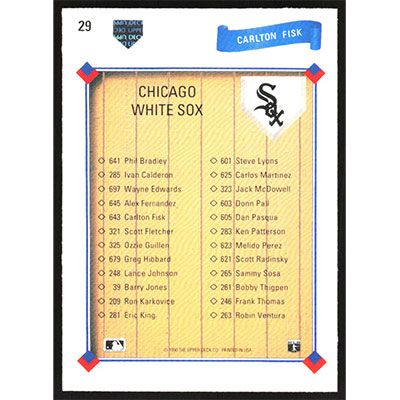 This is a 1991 Upper Deck Carlton Fisk Team Checklist baseball card. The card is #29 and pictures show condition.