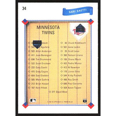 This is a 1991 Upper Deck Gary Gaetti Team Checklist baseball card. The card is #34 and pictures show condition.
