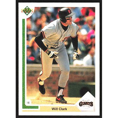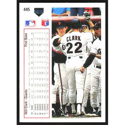 This is a 1991 Upper Deck Will Clark baseball card. The card is #445 and pictures show condition.