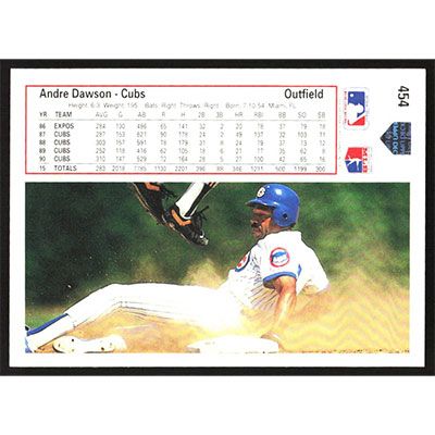 This is a 1991 Upper Deck Andre Dawson baseball card. The card is #454 and pictures show condition.