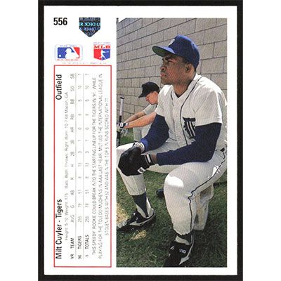 This is a 1991 Upper Deck Milt Cuyler baseball card. The card is #556 and pictures show condition.