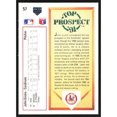 This is a 1991 Upper Deck John Ericks baseball card. The card is #57 and pictures show condition.