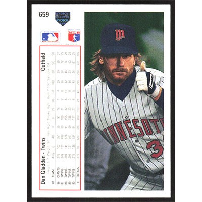 This is a 1991 Upper Deck Dan Gladden baseball card. The card is #659 and pictures show condition.
