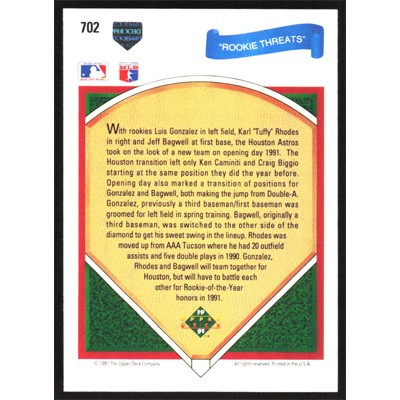 This is a 1991 Upper Deck Luis Gonzalez, Karl Rhodes and Jeff Bagwell Rookie Threats baseball card. The card is #702 and pictures show condition. Team(s): Houston Astros