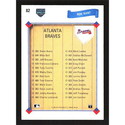 This is a 1991 Upper Deck Ron Gant Team Checklist baseball card. The card is #82 and pictures show condition.