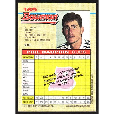 This is a 1992 Bowman Phil Dauphin baseball card. The card is #169 and pictures show condition.
