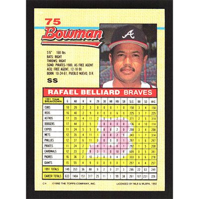 This is a 1992 Bowman Rafael Belliard autographed baseball card. This card has been signed, in blue, by Rafael Belliard, and is guaranteed authentic by Ballcardz.com. The card is #75 and pictures show condition.
