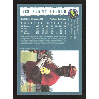 This is a 1992 Classic Draft Picks Foil Bonus Kenny Felder baseball card. The card is #BC9 and pictures show condition.