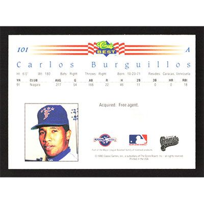 This is a 1992 Classic/Best Carlos Burguillos baseball card. The card is #101 and pictures show condition.