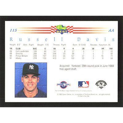 This is a 1992 Classic/Best Russell Davis baseball card. The card is #115 and pictures show condition.