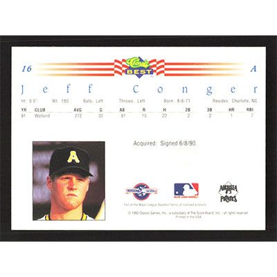 This is a 1992 Classic/Best Jeff Conger baseball card. The card is #16 and pictures show condition.