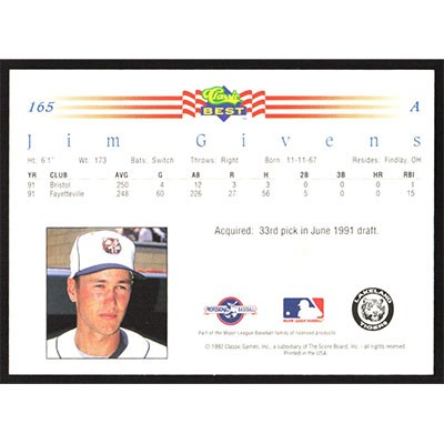 This is a 1992 Classic/Best Jim Givens baseball card. The card is #165 and pictures show condition.