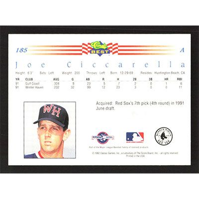 This is a 1992 Classic/Best Joe Ciccarella baseball card. The card is #185 and pictures show condition.