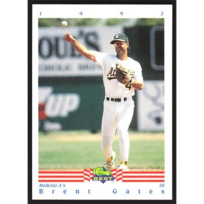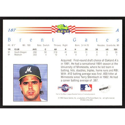 This is a 1992 Classic/Best Brent Gates baseball card. The card is #187 and pictures show condition.