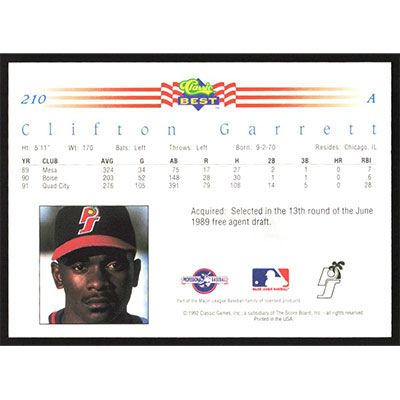 This is a 1992 Classic/Best Clifton Garrett baseball card. The card is #210 and pictures show condition.