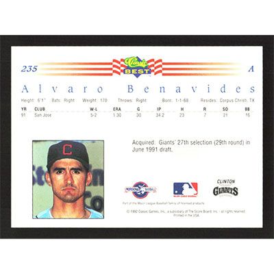 This is a 1992 Classic/Best Alvaro Benavides baseball card. The card is #235 and pictures show condition.