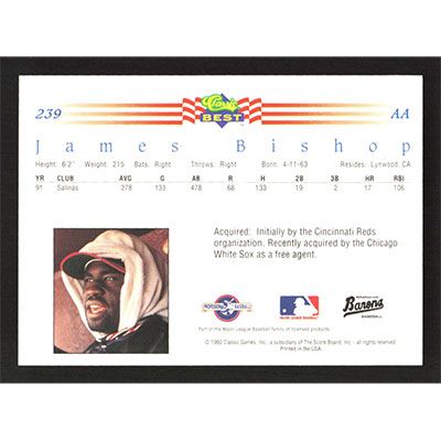 This is a 1992 Classic/Best James Bishop baseball card. The card is #239 and pictures show condition.