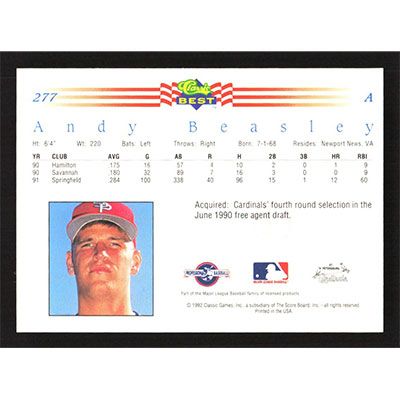 This is a 1992 Classic/Best Andy Beasley baseball card. The card is #277 and pictures show condition.