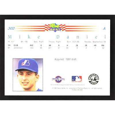 This is a 1992 Classic/Best Mike Daniel baseball card. The card is #302 and pictures show condition.