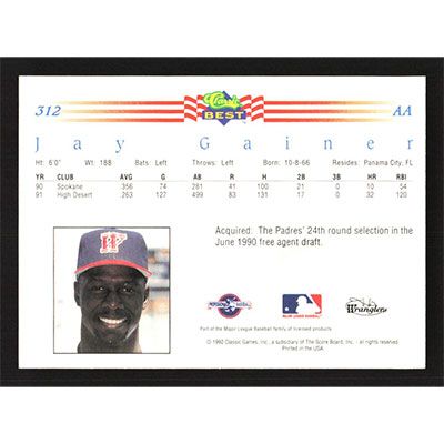 This is a 1992 Classic/Best Jay Gainer baseball card. The card is #312 and pictures show condition.