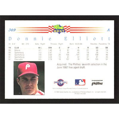 This is a 1992 Classic/Best Donnie Elliott baseball card. The card is #369 and pictures show condition.